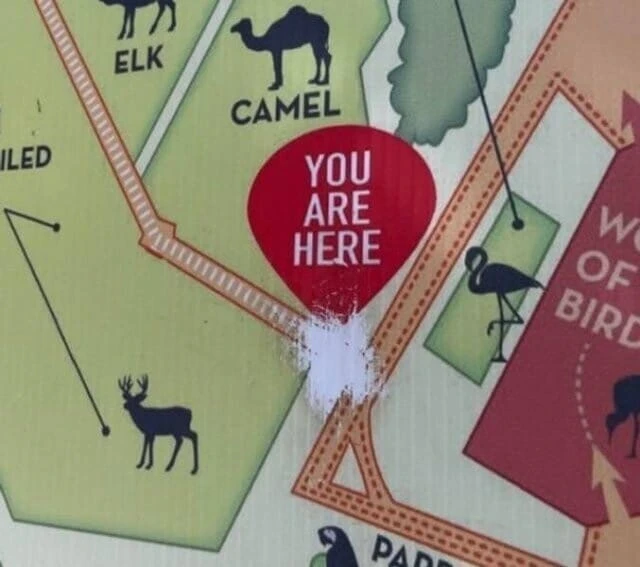 The "You are here" sign on the zoo map has worn away from frequent use.