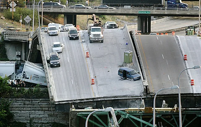 Due to an outdated design, a section of the freeway bridge collapsed during rush hour, sending several cars into the Mississippi River. Thirteen people were killed and 145 injured.