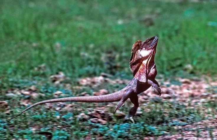 Lizards don't have a diaphragm, so the same muscles that bend the spine when running push air into the lungs. During fast movement, these muscles can't simultaneously support running and a full inhalation. A physiological conflict arises. Therefore, when sprinting, the lizard is forced to periodically stop to breathe.