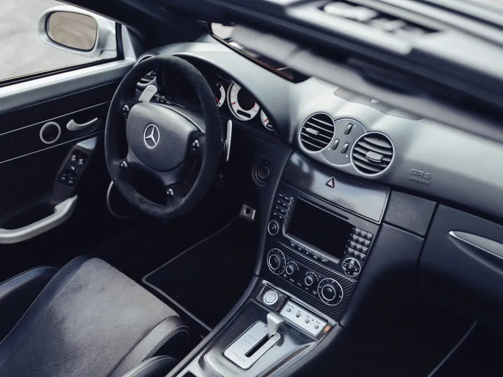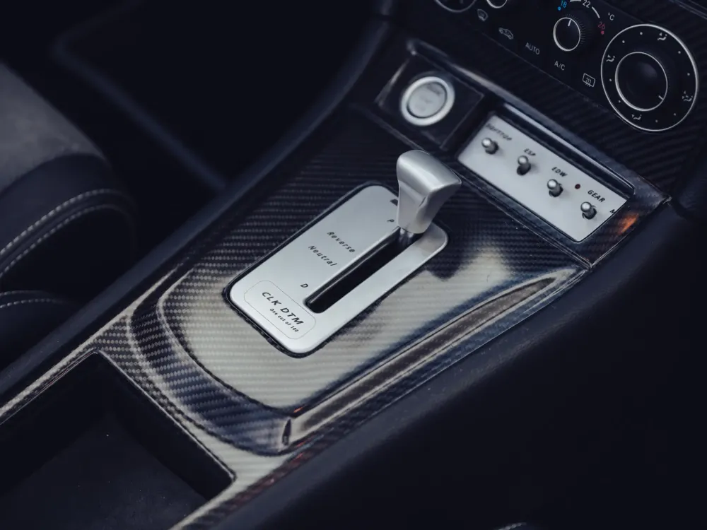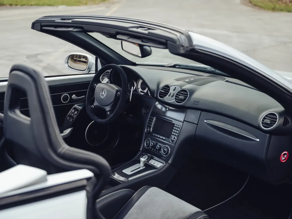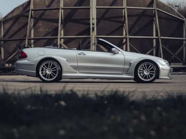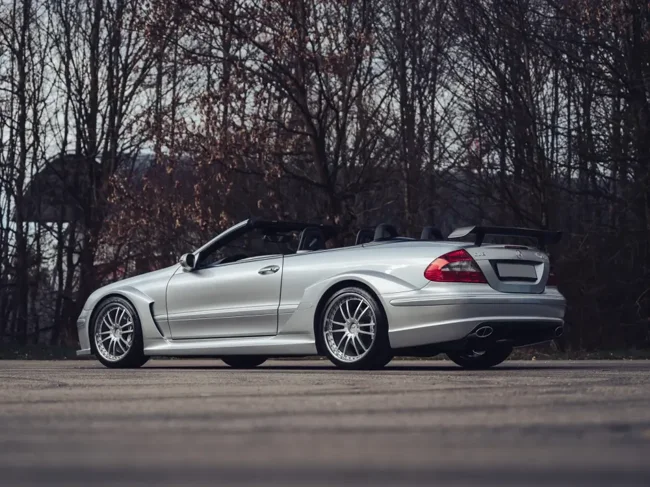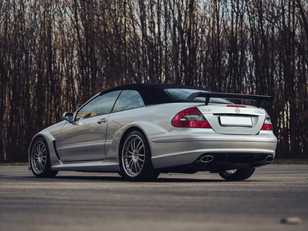 This modification's chassis, reimagined for racing, was paired with a 5.4-liter supercharged V8 producing 582 hp and 800 Nm. The convertible was claimed to accelerate from 0 to 100 km/h in 3.9 seconds and reach a top speed of 300 km/h. A matching body kit with flared wheel arches and a fixed rear wing was developed for the CLK DTM, and the standard seats and rear bench were replaced with four bucket seats.