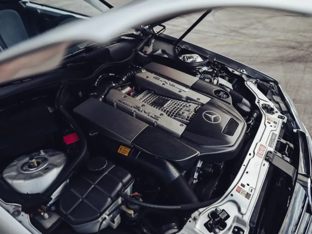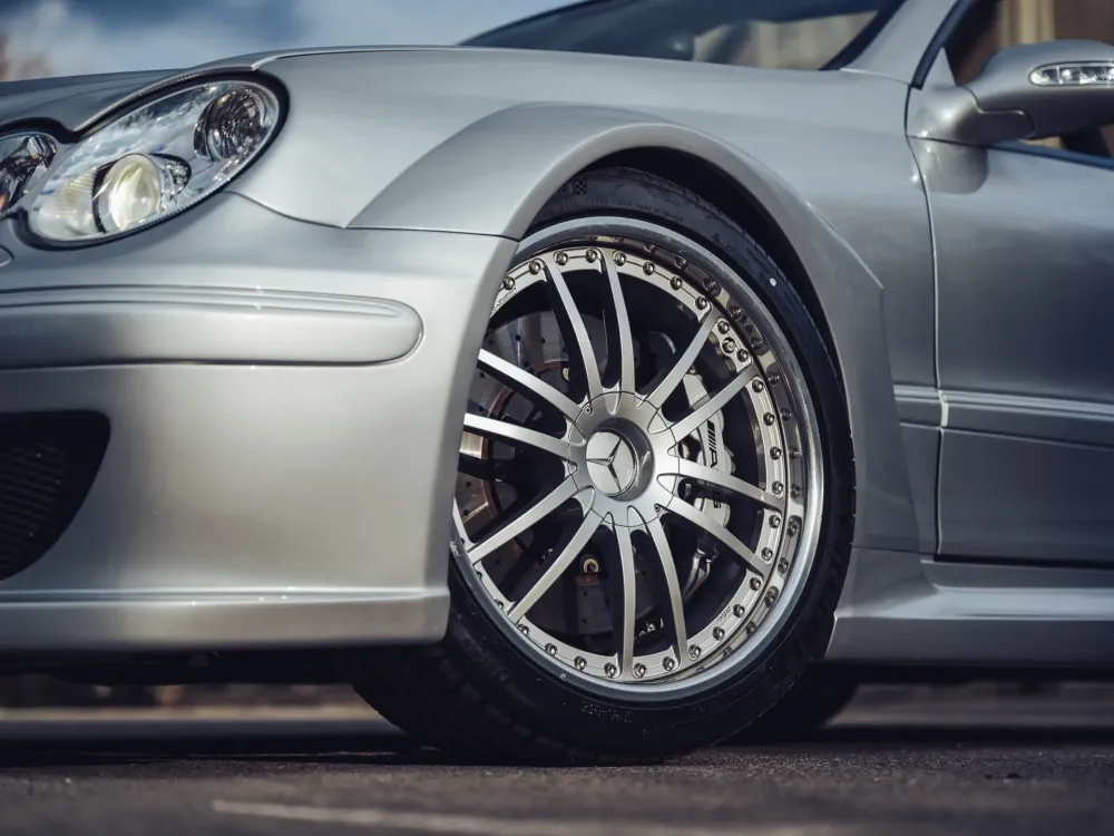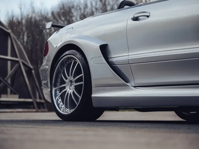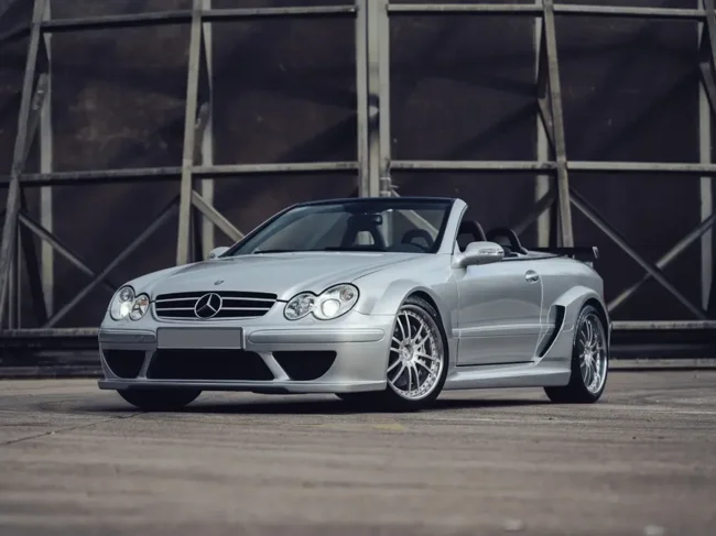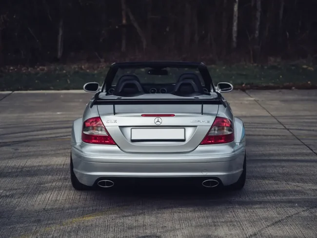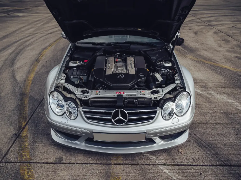 This modification's chassis, reimagined for racing, was paired with a 5.4-liter supercharged V8 producing 582 hp and 800 Nm. The convertible was claimed to accelerate from 0 to 100 km/h in 3.9 seconds and reach a top speed of 300 km/h. A matching body kit with flared wheel arches and a fixed rear wing was developed for the CLK DTM, and the standard seats and rear bench were replaced with four bucket seats.