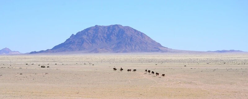 The bare, sun-baked Garuba Plains on the eastern edge of the Namib Desert could rightly be called hell. There's nothing here but barren land, heat, and the meager remains of vegetation.