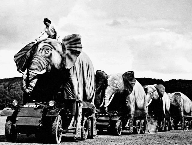 English armored cars Lanchester Mk. II, disguised as elephants. India, 1941.