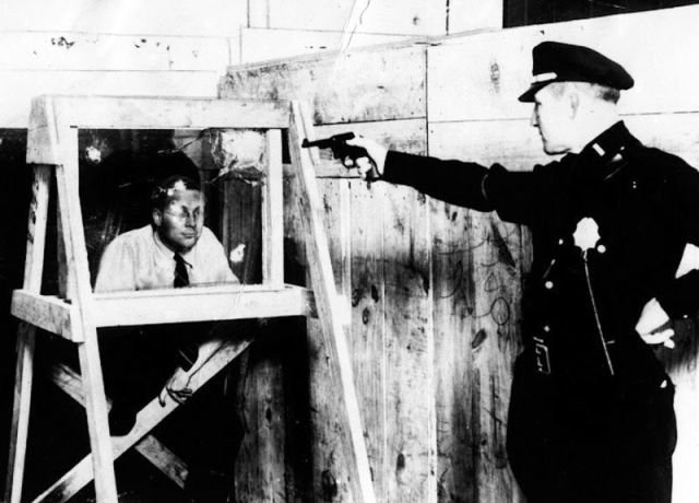 An NYPD shooter tests bulletproof glass for strength, 1931.