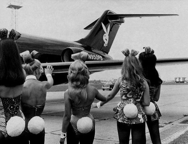 The Playboy Girls greet Hugh Hefner as his private jet lands in London, 1970.