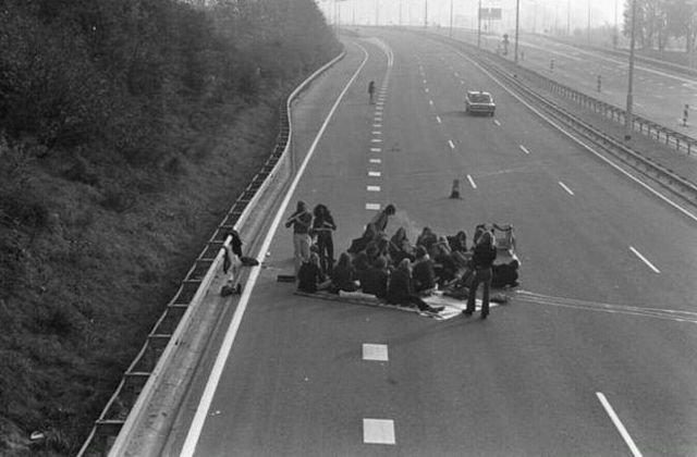 Picnic on the highway during the gasoline crisis. Kingdom of the Netherlands. November 4, 1973.