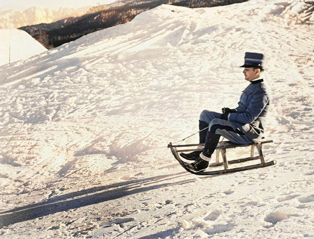 An Italian officer rides a sleigh in Sestriere, Italian Alps, 1934