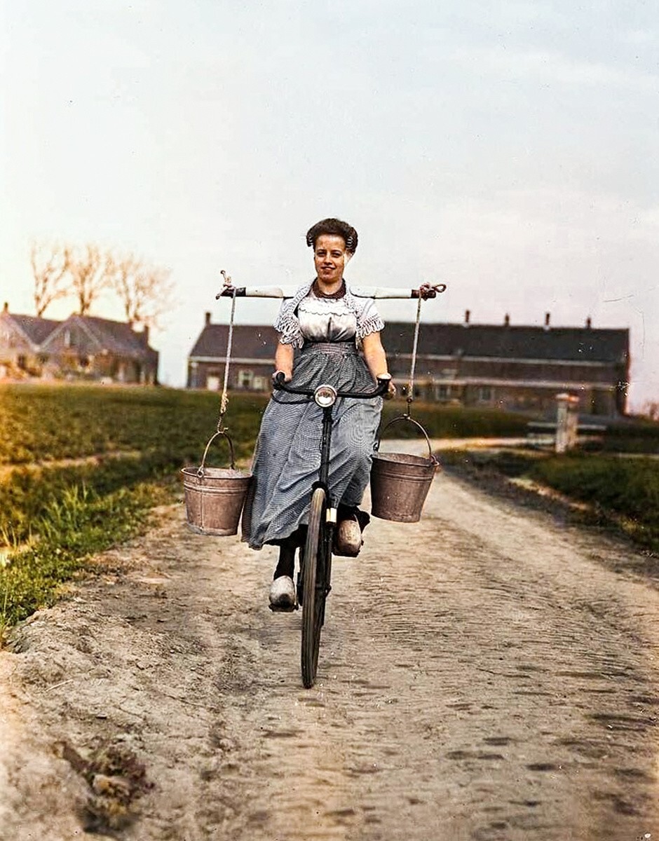 A peasant woman rides a bicycle with buckets of milk on the yoke. Netherlands, 1946