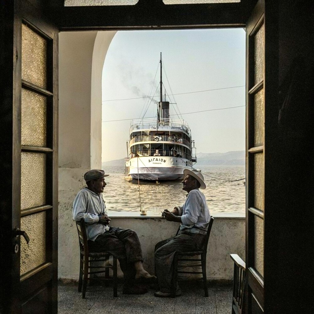 A heartfelt conversation over a cup of coffee in the port of Santorini. Greece, 1954