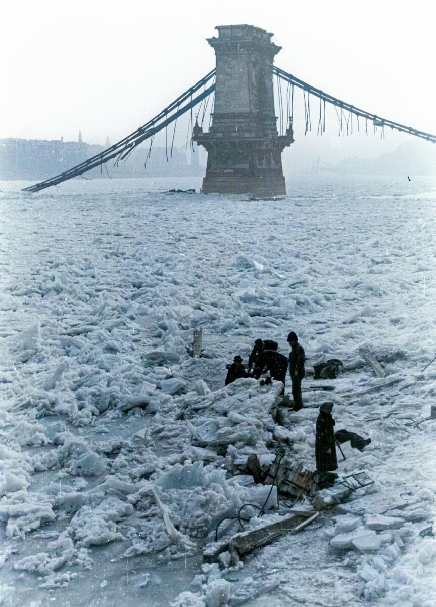 The blown up Chain Bridge of Budapest and the frozen Danube, January 15, 1945