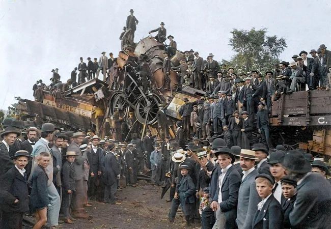 A collision of two locomotives in the state of Texas was arranged by a certain citizen by the last name Crush. 40 thousand spectators gathered to watch it. As a result, 2 people died, the photographer's eye was damaged by a bolt.