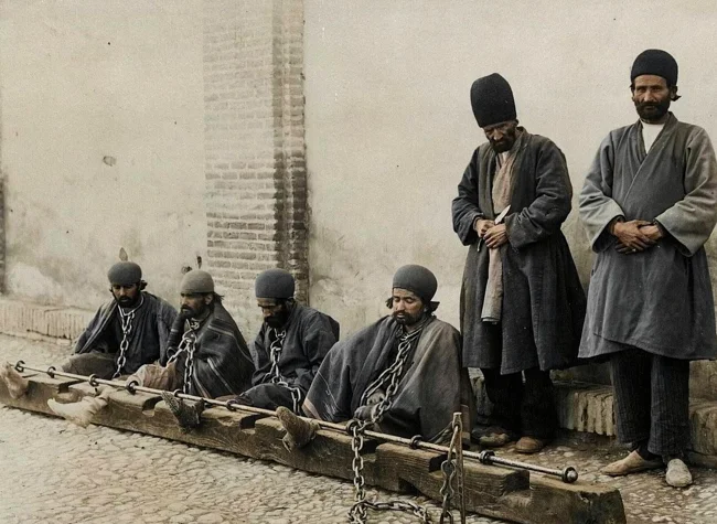 Prisoners and a guard with a knife. Persia, 1899.