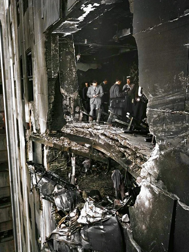 A hole in a skyscraper from a collision with a bomber, New York, 1945.