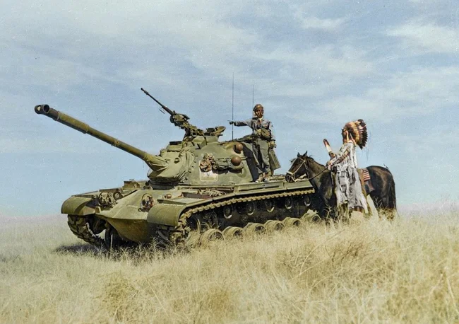 A Native American chief visits his son during a U.S. Army armored training exercise, 1950s.