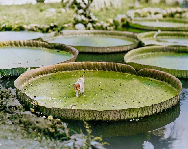 Kitten on a leaf of Victoria amazonica, Philippines, 1935.