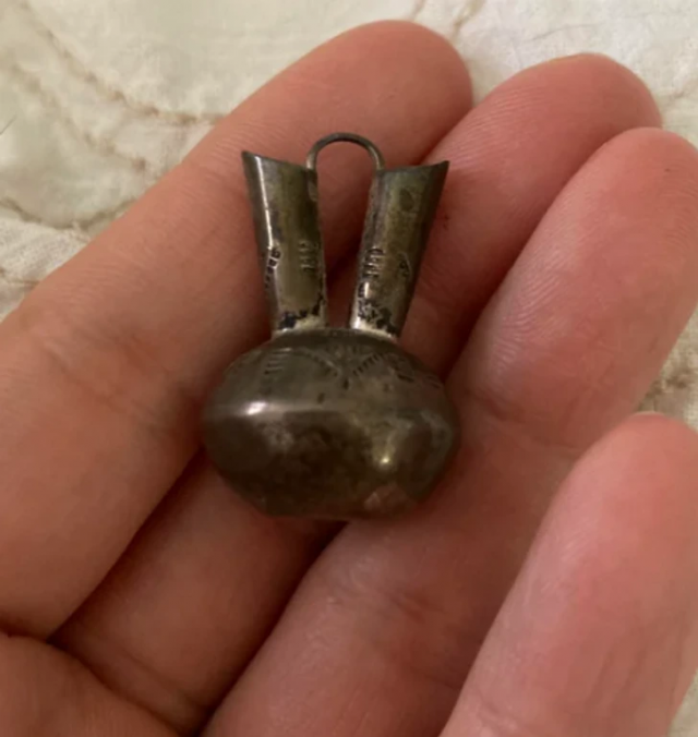 This is a traditional miniature wedding vase made of silver. The noses symbolize husband and wife, and the patterns represent the couple's journey.
