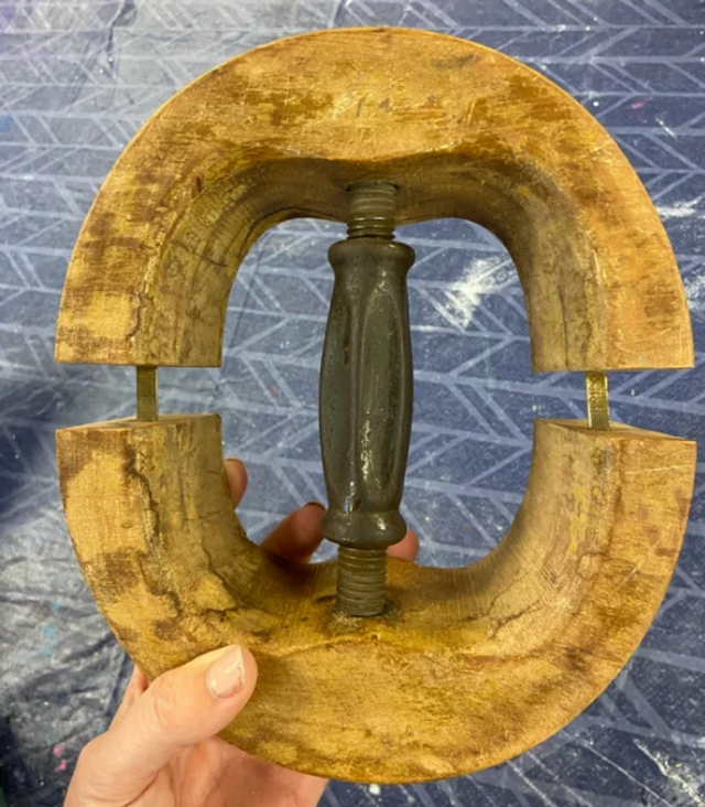 “A colleague found it in an antique store. Wooden device. Maybe to measure something or stretch it?”