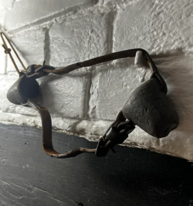 “Leather strap with 2 cup-shaped ends, probably lead. Found in a 16th century English farmhouse."