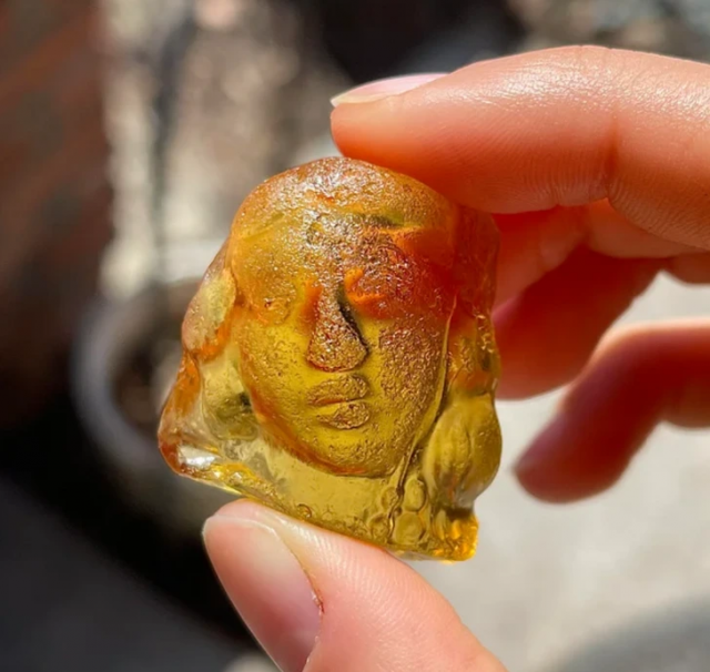“The face is made of yellow-amber glass. Found it by the lake"