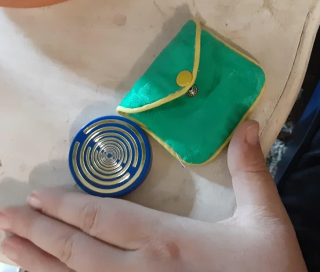 “A small blue circle with silver accents, lay in a green and yellow silky bag”