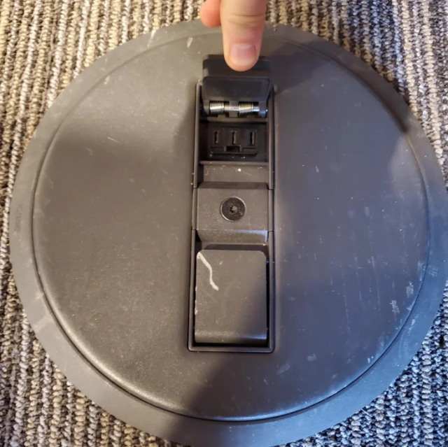 Power distribution system built into the table. It uses a special outlet for computer equipment to prevent someone accidentally plugging a vacuum cleaner into it.