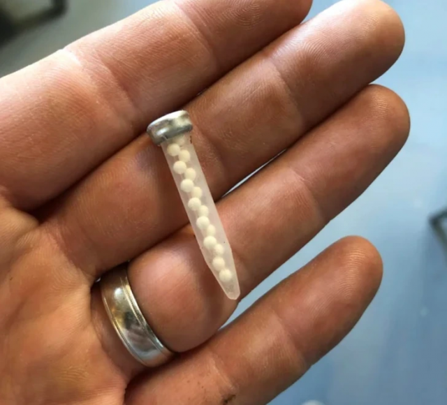 “Found this behind a commercial freezer during a renovation. Plastic body, plastic balls, metal lid, about 40mm long"