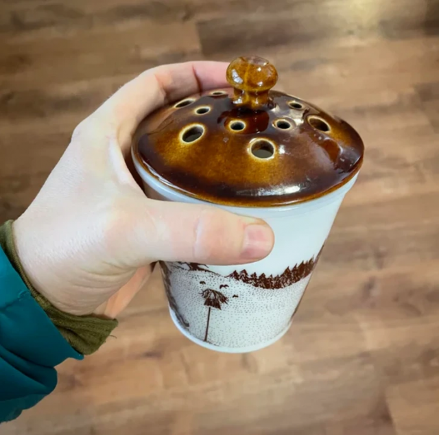 "Ceramic cup with various holes in the lid"