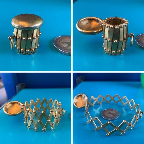 1. "Brass, 10 x 7.5 centimeters, hinge opens at 90°. The smaller part is ribbed on the inside"