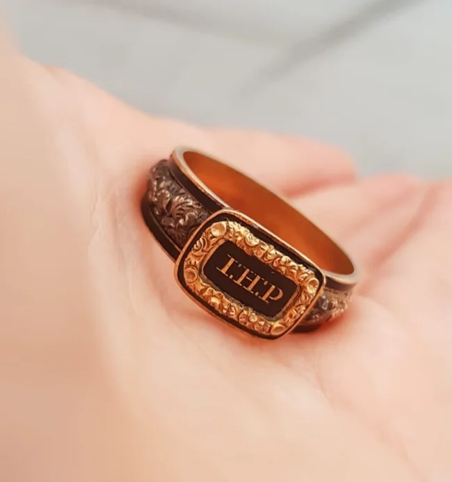 Such rings are worn as a sign of mourning. The initials on it belong to the deceased loved one.