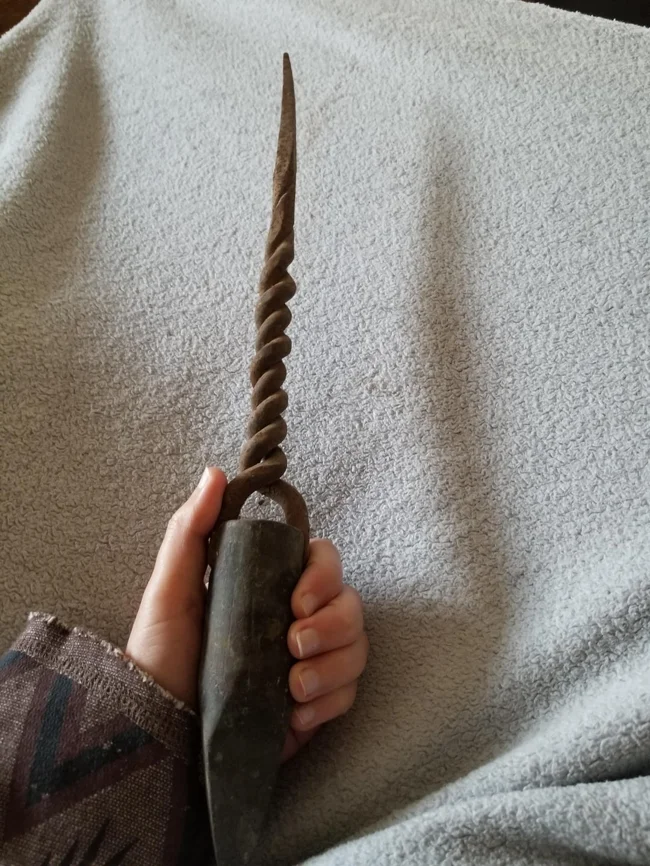 This is a very old soldering iron. One end is the main soldering element, usually copper. The other end should have a wooden handle.