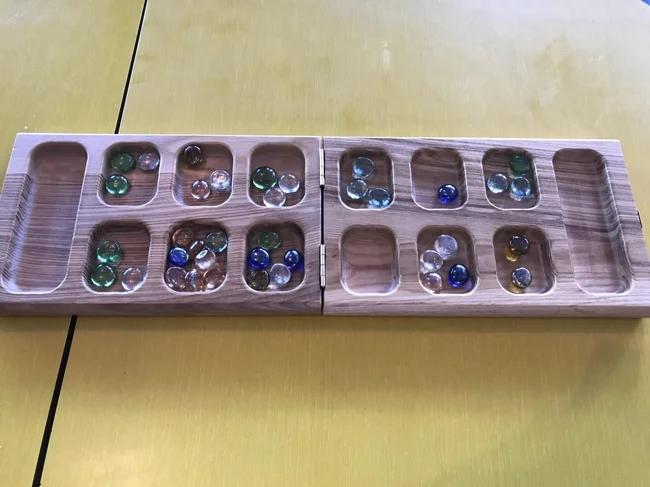 This is a board game for two called mancala. It is also often called the grain game. When calculating, the numbers are replaced by pebbles, and the empty holes act as zeros.