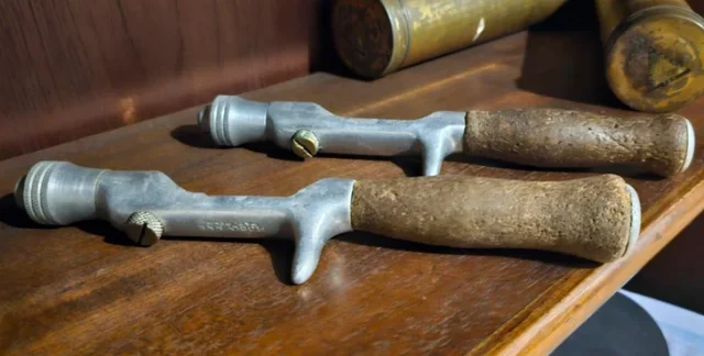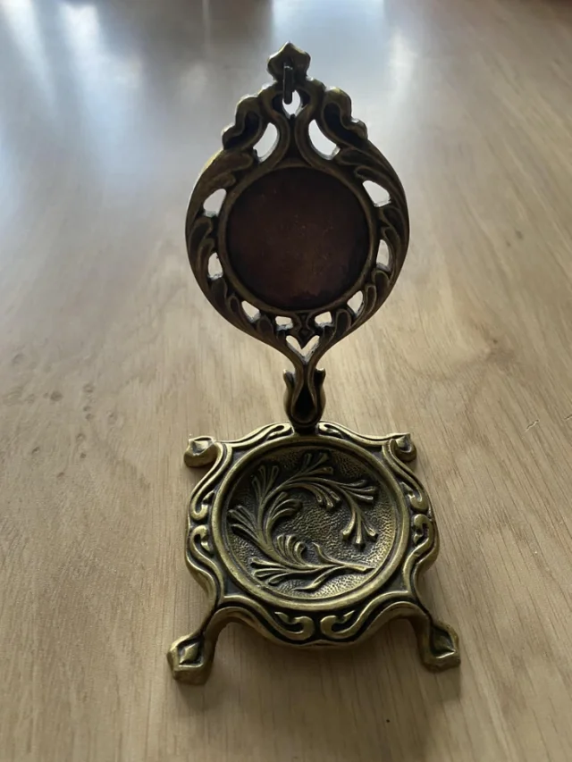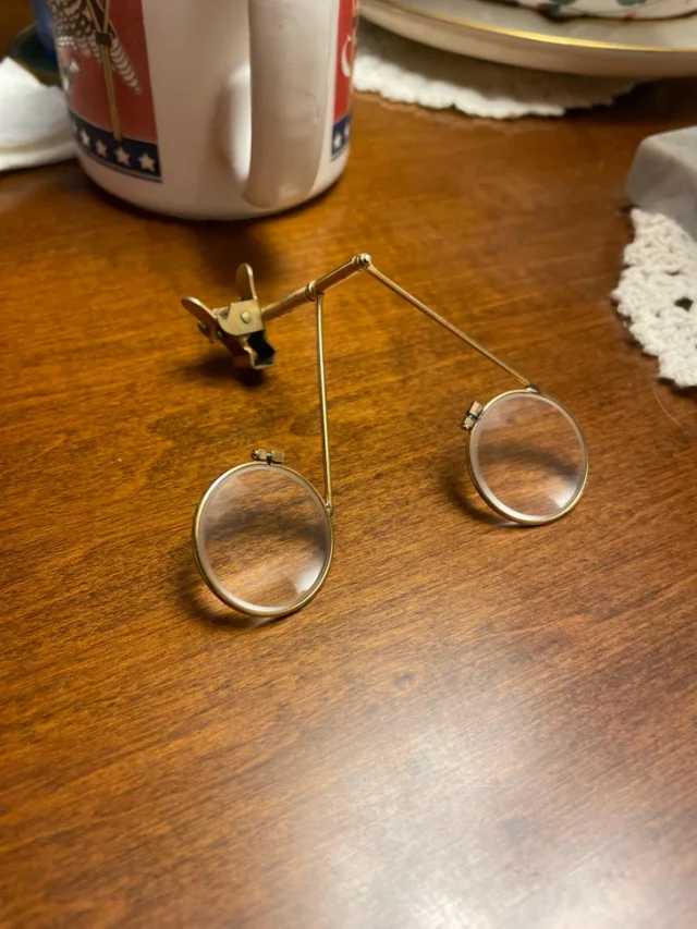 "A lightweight brass device on a clip, similar to miniature glasses"