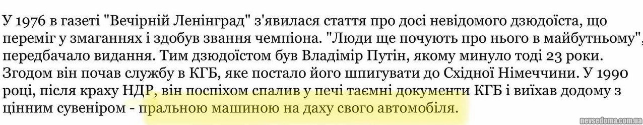 «In 1976 in the newspaper «Evening Leningrad» an article appeared about an unknown judoka who won the competition and received the title of champion. "People will still hear about him in the future" publication predicted. That judoka was Vladimir Putin, who was then 23 years old. He soon joined the KGB, which sent him to spy in East Germany. In 1990, after the collapse of the GDR, he hurriedly burned secret KGB documents in the oven and went home with a valuable souvenir — washing machine on the roof of your car"