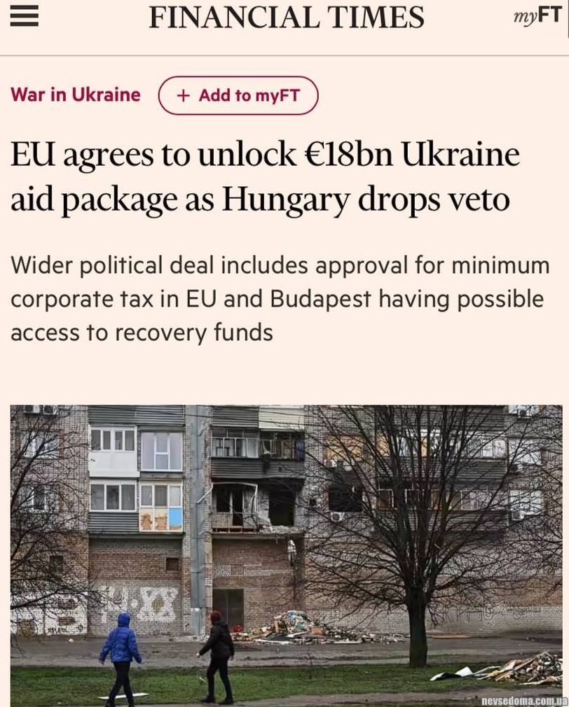 - A package of assistance to Ukraine from the EU for 18 billion euros has been agreed, – Financial Times (https://www.ft.com/content/b4c40932-163a-485a-8fff-4ad35d0d1a82).