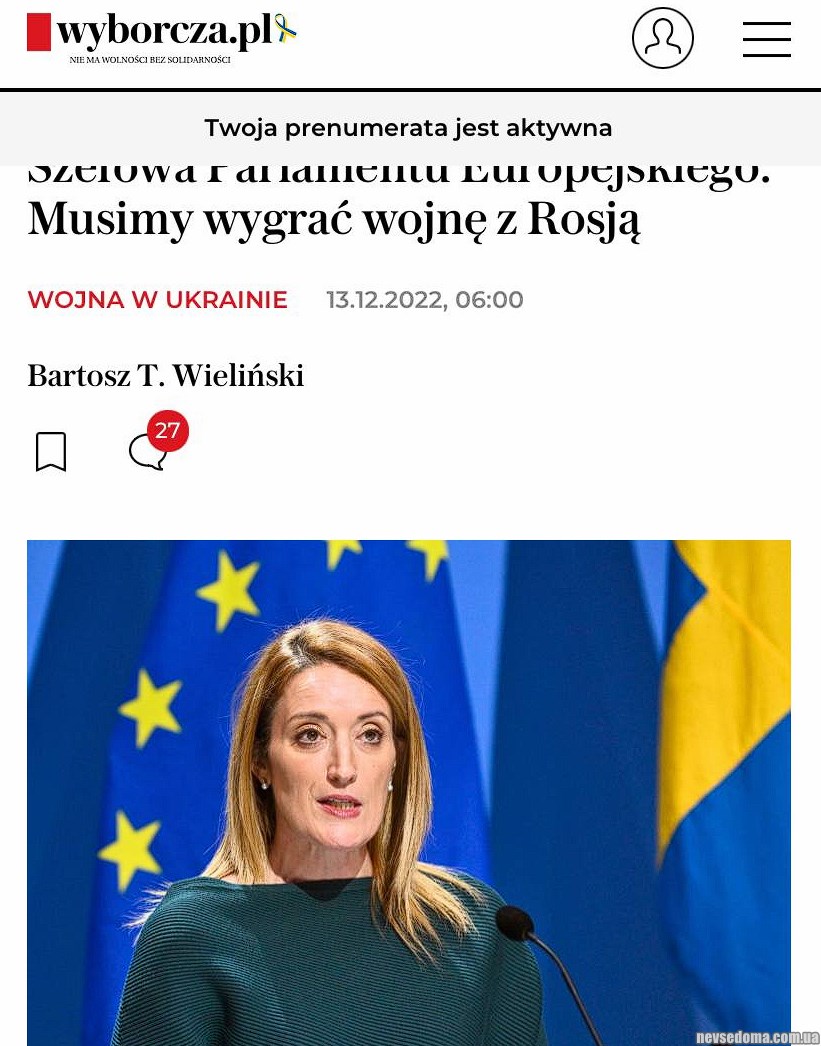 - We must win the war with Russia, and we cannot negotiate with a gun to our heads, said Roberta Metsola, President of the European Parliament in an interview (https://wyborcza.pl/7,75399,29251026,szefowa-parlamentu-europejskiego -musimy-wygrac-wojne-z-rosja.html) to the newspaper Wyborzca.