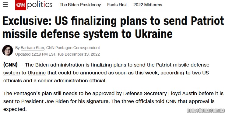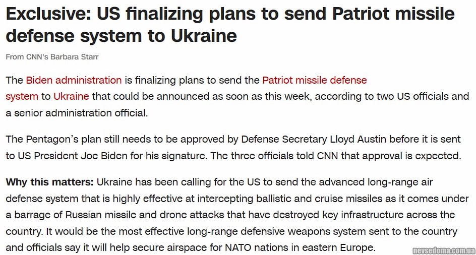 - The United States is preparing to supply Patriot to Ukraine, finally