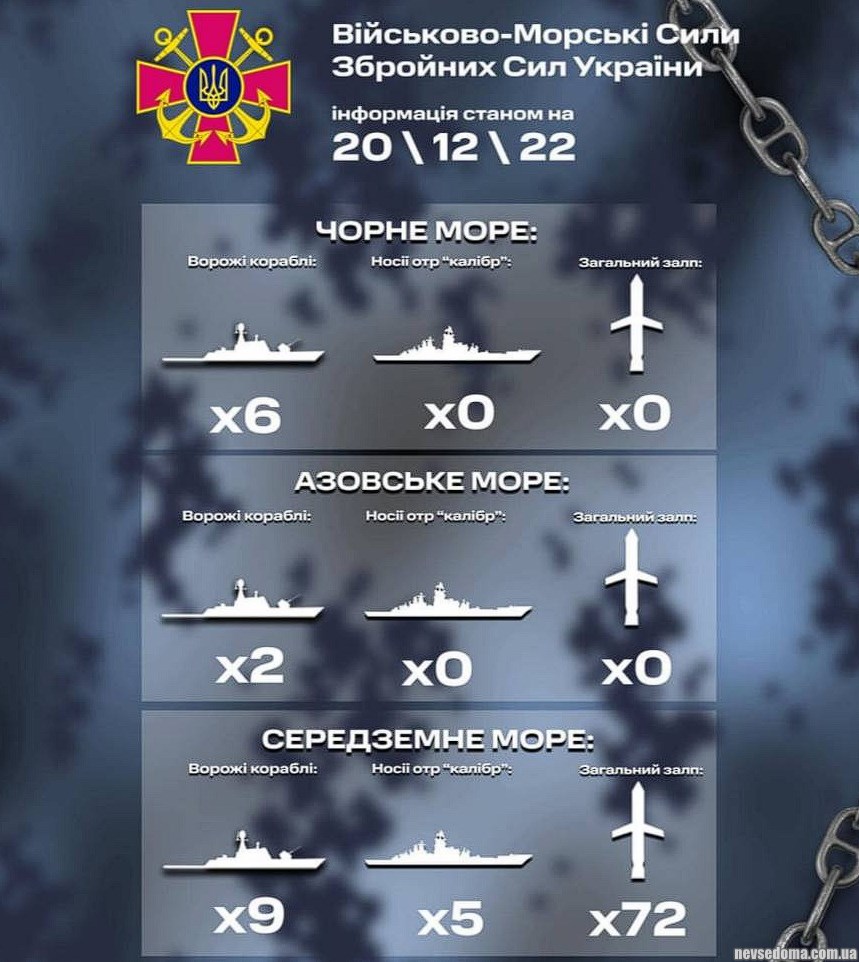 In the Mediterranean Sea – 9 ships, of which 5 are carriers of Caliber cruise missiles, a total salvo of – 72 missiles.