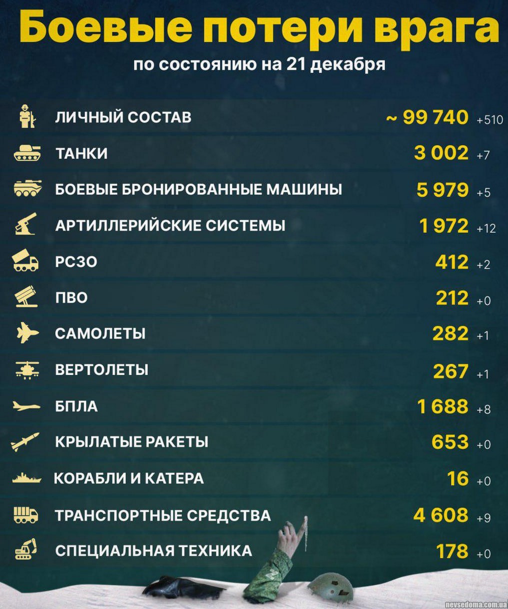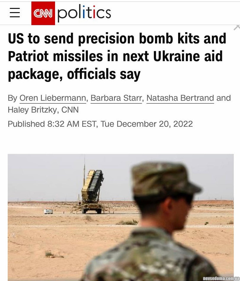 - The United States in a new package of military assistance to Ukraine plans to transfer electronic equipment that can turn unguided aircraft munitions into "smart bombs", reports (https://edition.cnn.com/europe/live-news/russia-ukraine -war-news-12-20-22/h_26591883fb77a5ab70e6194d9af266d9) CNN.