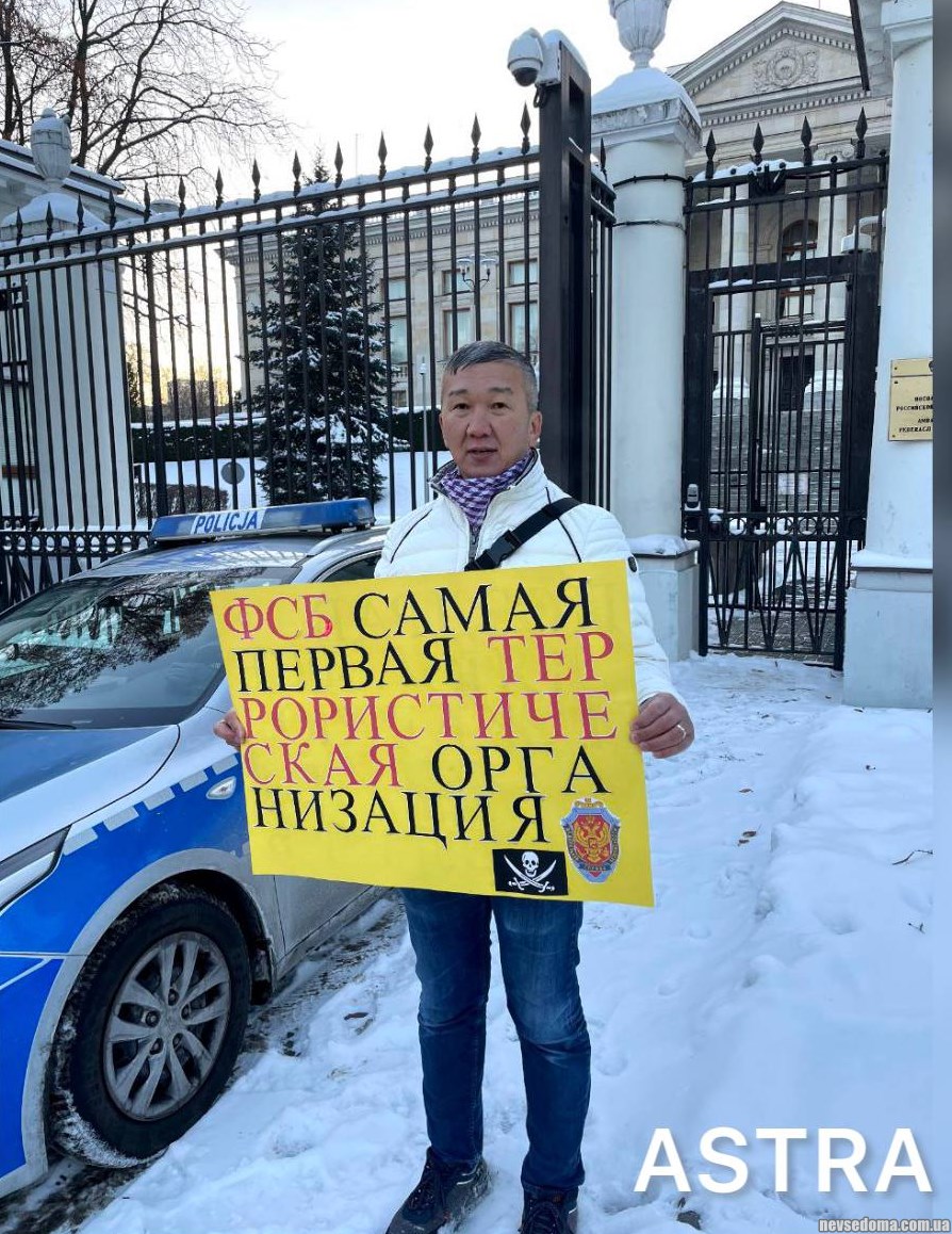 - ASTRA: Human rights activist from Buryatia Yevgeny Khasoev congratulated the FSB of the Russian Federation on their professional holiday with a single picket near the Russian Embassy in Warsaw