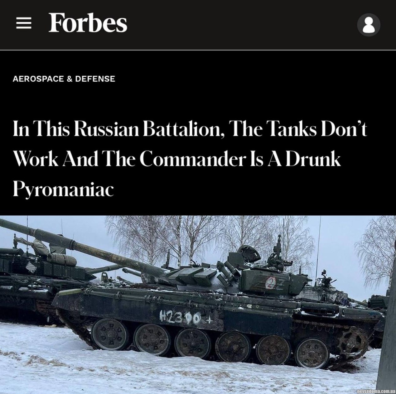 - "The tanks don't work, and the commander is a drunken pyromaniac": Forbes journalist (https://www.forbes.com/sites/davidaxe/2023/01/07/in-this-russian-battalion-the-tanks -dont-work-and-the-commander-is-a-drunk-pyromaniac/?sh=c16894b3c3f0) mocked the deplorable state of the Russian army.