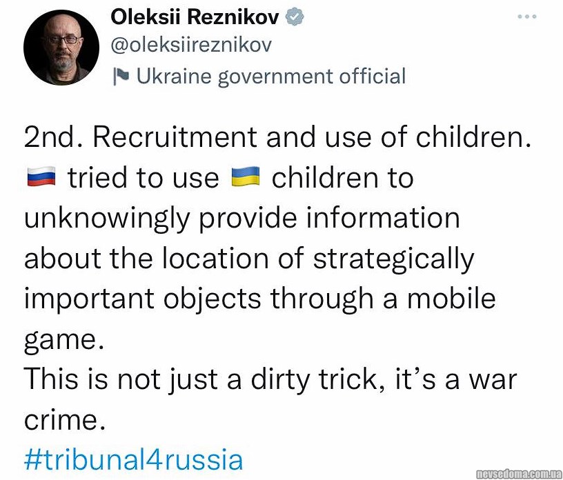 - Russian special services recruited Ukrainian children through a mobile game, said (https://twitter.com/oleksiireznikov/status/1612022104488124417?s=46&t=Q-k14lxDyWfsPu8F-4vZ0g) Minister of Defense of Ukraine Oleksiy Reznikov.