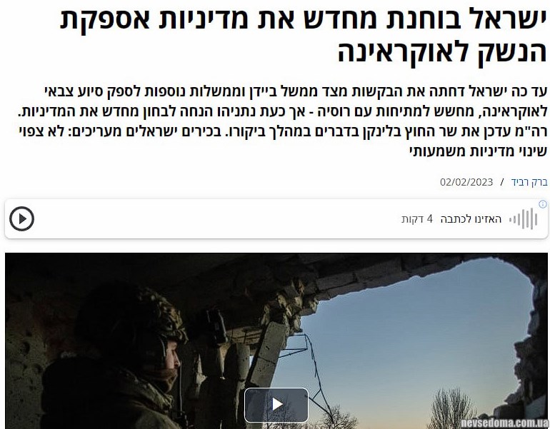 Israeli Prime Minister Benjamin Netanyahu ordered (https://news.walla.co.il/item/3555734) to review the assistance policy for Ukraine and, in particular, we are talking about the supply of defense weapons systems.