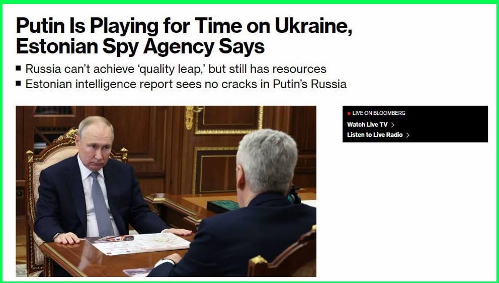 "Pynya is convinced that time is on his side because he "has sufficient resources to fuel his war machine," — says (https://www.bloomberg.com/news/articles/2023-02-08/ putin-is-playing-for-time-on-ukraine-estonian-spy-agency-says?srnd=premium-europe) in the intelligence report.
