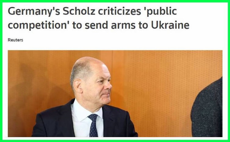 "What hurts our unity is this public competition to outdo each other in areas: battle tanks, submarines, aircraft - who will give more?" — considers (https://www.reuters.com/world/europe/germanys-scholz-criticizes-public-competition-send-arms-ukraine-2023-02-08/) Scholz