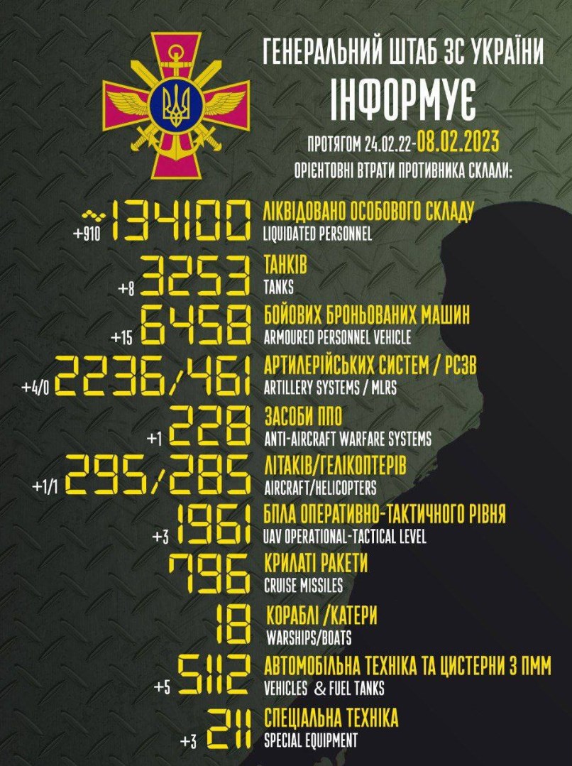 "The decision on the supply of British aircraft to Ukraine has not yet been made, but this issue is being actively considered by Wallace", — reported (https://www.theguardian.com/world/live/2023/feb/08/russia-ukraine-war-live-updates-russian-offensive-kharkiv-or-zaporizhzhia-says-kyiv-joe-biden- to-stand-with-ukraine#top-of-blog) official representative of the British Prime Minister.