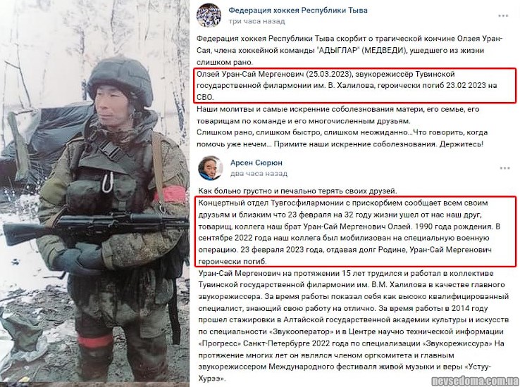 ▪️Sound engineer and hockey player Olzey Uran-Sai Mergenovich, born in 1990. from Tyva in September 2022 he was mobilized, and already on February 23, 2023 he "died tragically in the NWO".