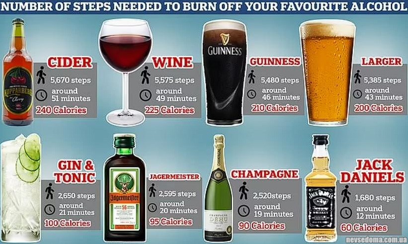 On the photo — the number of calories in the most popular alcoholic beverages, as well as the number (https://www.dailymail.co.uk/health/article-11816167/Exact-number-steps-needed-burn-favourite-alcohol-revealed.html) steps, which must be passed in order to compensate them.