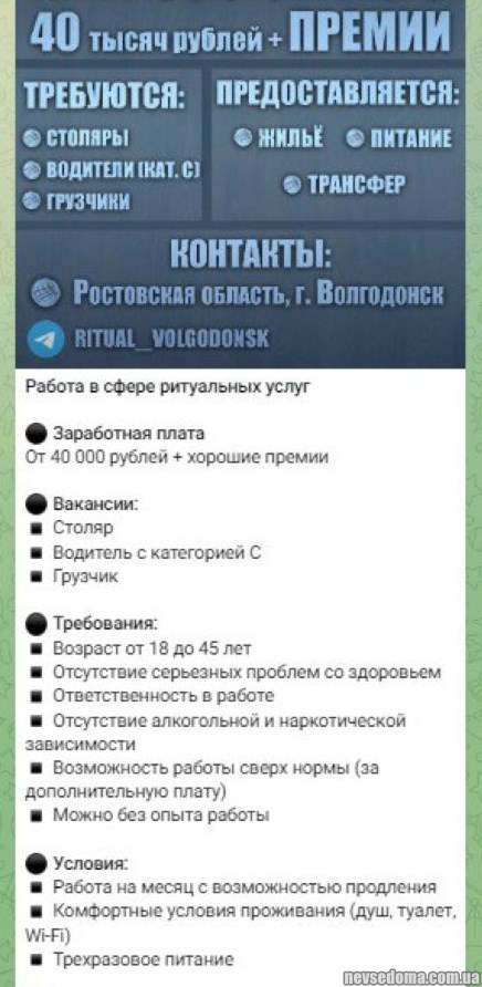 - There are not enough hands to make coffins - In Volgodonsk, carpenters and joiners are required for a ritual agency. The salary is promised very high by local standards - up to 60 thousand per month. The locals do not even believe in such conditions and are afraid that they can mobilize in this way.