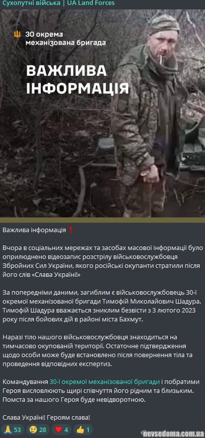 ▪️Tweets and posts in social networks began to be massively written by people around the world as a sign of solidarity with a captured Ukrainian shot by Russians. He said "Glory to Ukraine", for which he received several bullets almost at point blank range.