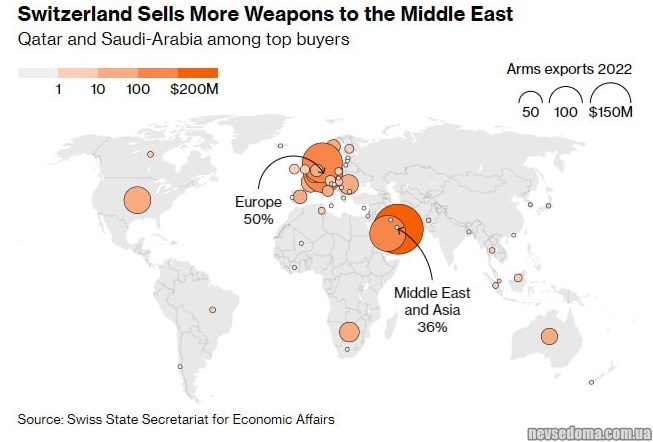 Arms sales have risen (https://www.bloomberg.com/news/articles/2023-03-07/swiss-arms-exports-jump-29-as-industry-laments-neutrality) to $1 billion. Among the main buyers of Swiss weapons and ammunition — Europe and the Middle East.